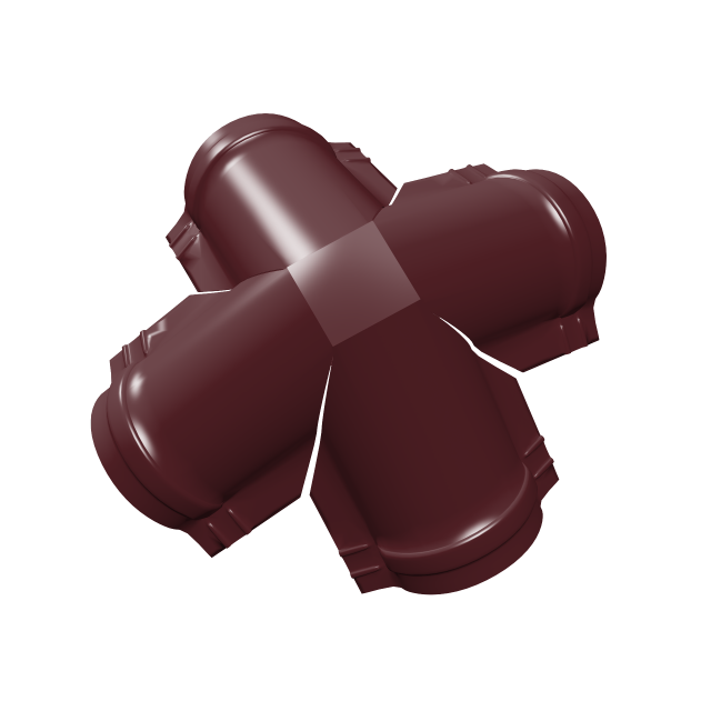 Четверник конька полукруглого 0,5 Satin Matt TX с пленкой RAL 3005 применяются в качестве соединения полукруглых коньков на шатровых кровлях.